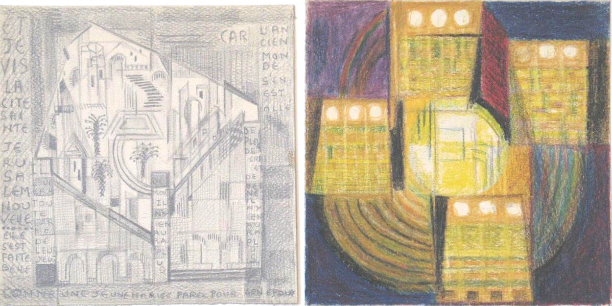 Jérusalem Céleste, préparations, 1958 Accueil > Dessins/Pastels/Préparations > Jérusalem Céleste, préparations, 1958 3 avril 1958 Le Coultre Jérusalem Céleste, préparations, 1958 Dessin et pastel, 16 x 16 cm environ